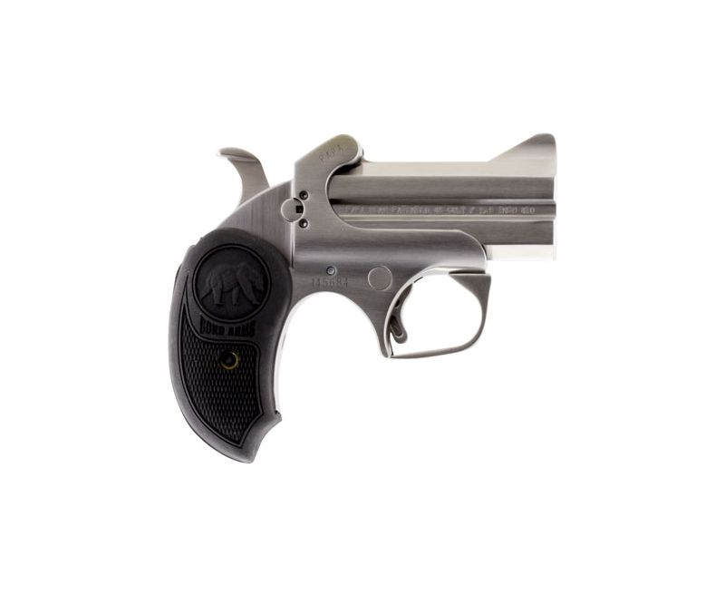 Rowdy is compatible with all standard Bond Arms barrels for easy caliber conversions. The pistol has stainless steel double-barrel and frame, the barrels and trigger are polished and the frame is sand blasted. Features- Automatic spent casting extractor, patented rebounding hammer, retracting firing pins, cross-bolt safety and spring-loaded, cammed locking lever.
