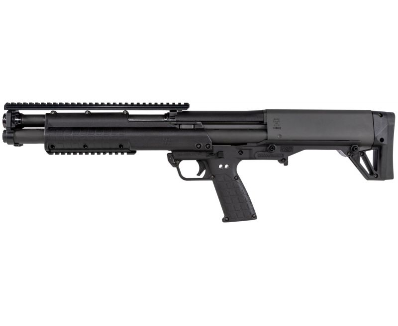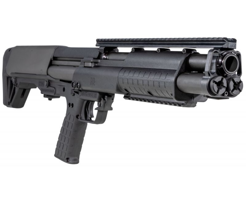 Kel-Tec’s KSG is a simple and reliable pump action shotgun able to feed from either the left or right tube, with a manual feed side selector lever located behind the trigger guard. The KSG holds 6+6+1 (or 7+7+1 depending on shell length.The pump includes top and bottom Picatinny rails to mount accessories and optics. The soft rubber butt pad helps to tame recoil. The KSG receiver is made from hardened steel and the magazine tubes have been welded in place. The grip and stock assembly is made of glass reinforced nylon (Zytel) and is easily disassembled by pushing out two pins, which store in two holes in the grip when removed. It has built-in forward and rear sling loops, and includes a basic sling.